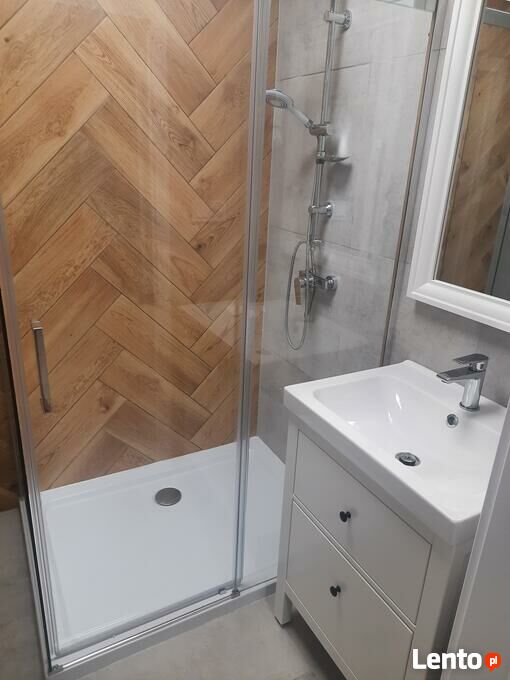 = = w łazience zamontowano kabinę prysznicową 90/120 cm z deszczownią oraz dużą umywalkę z szafką z szufladami.