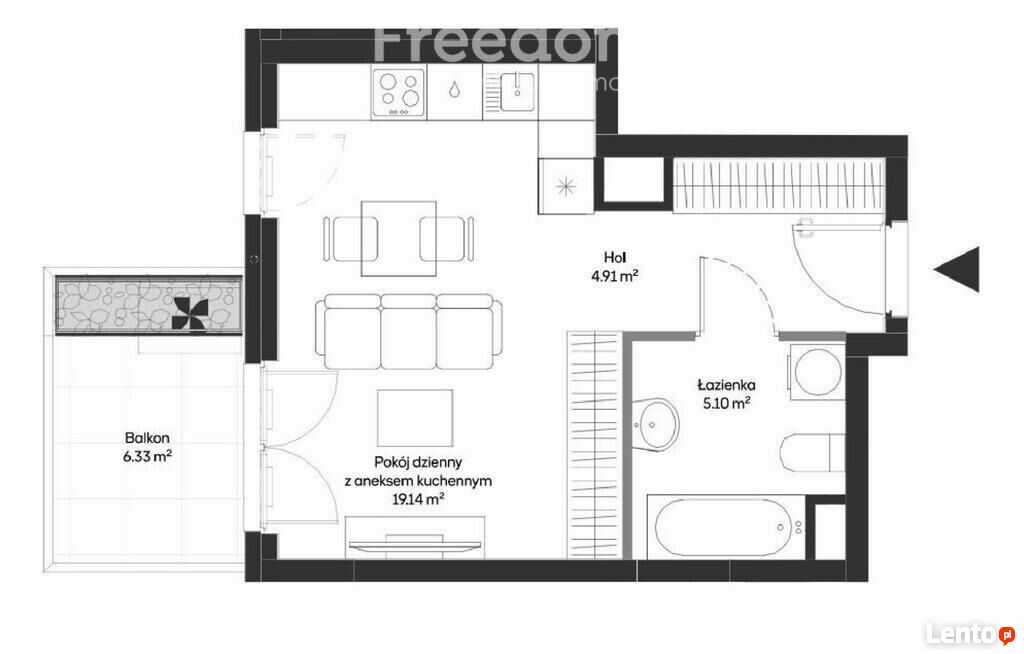Mieszkanie o powierzchni 29,15 m2 z balkonem o powierzchni 6,33