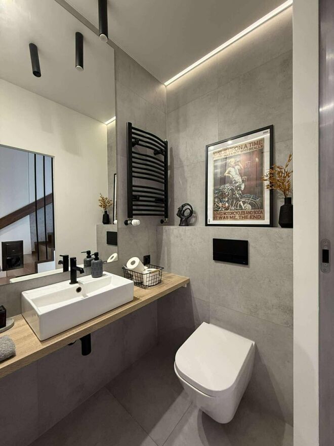 - na parterze znajduje się przestronny salon z kominkiem, półotwartą kuchnią oraz wyjściem na taras i ogród, a także toaleta.