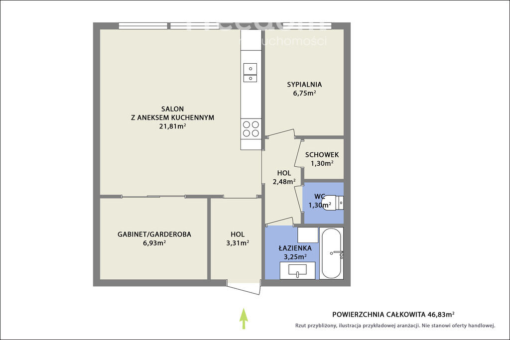 m²), sypialnia (6,75 m²), łazienka z wanną i prysznicem (3,25