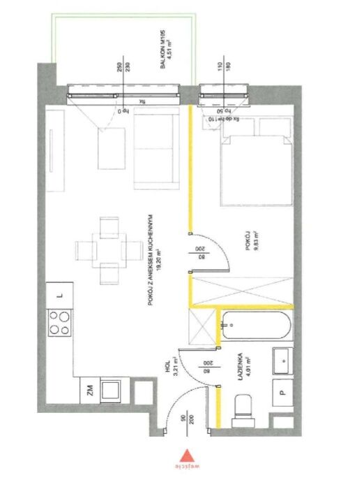 Mieszkanie posiada bardzo praktyczny rozkład - w salonie okno na całą ścianę idealnie doświetla i optycznie powiększa pomieszczenie. W sypialni zmieścimy duże, podwójne łóżko oraz szafę na całą szerokość pokoju. Aneks kuchenny w kształcie litery L zapewni wystarczający blat roboczy i sporo miejsca do przechowywania. Całość pozwoli na komfortowe użytkowanie zarówno przez singla, parę, jak i jako inwestycja pod wynajem.