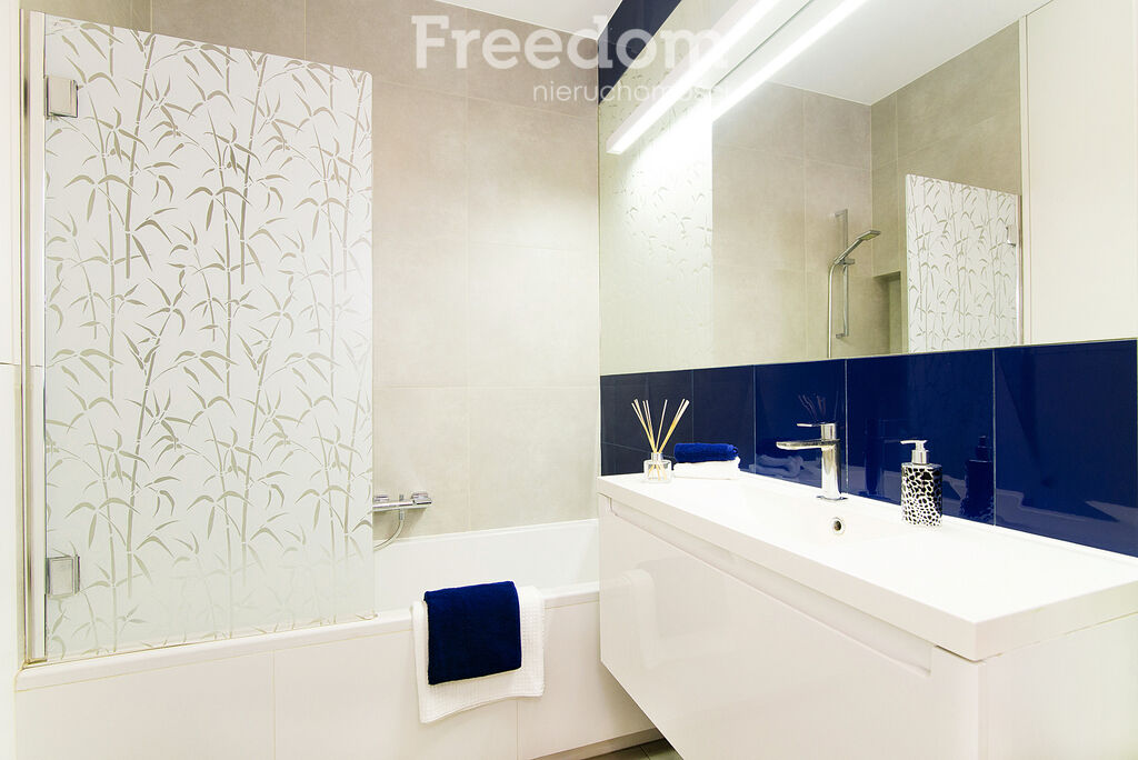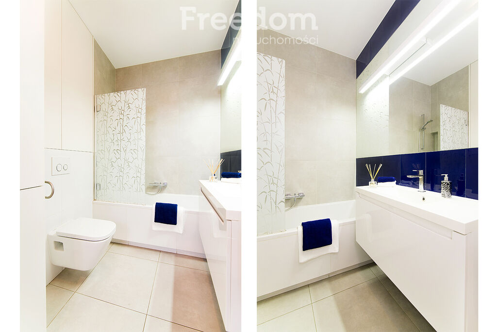 Łazienka z wygodną wanną, pralką oraz miejscami do przechowywania
