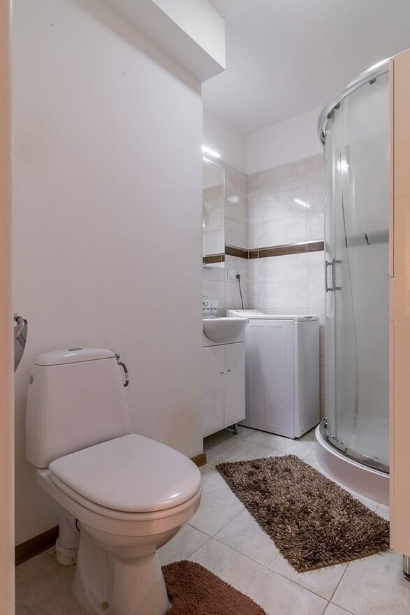 Łazienka: szafka, umywalka z szafką, pralka, prysznic.
