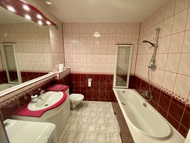 Łazienka: lustro z półką, pralka, wanna, szafka z lustrem,