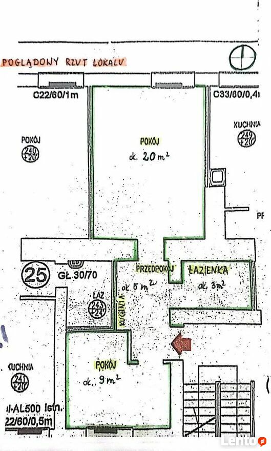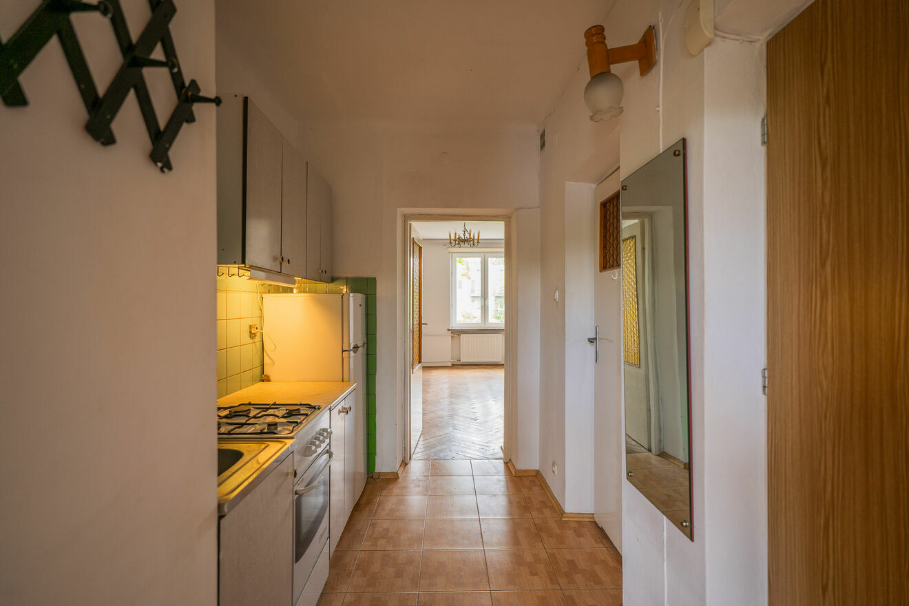 Pokój większy (ok.20 m2)- (południowy zachód), z możliwością stworzenia aneksu kuchennego lub osobnej garderoby i pomieszczenia gospodarczego. Drugi pokój (ok.9 m2) od strony podwórka (północny wschód). Ustawna łazienka z wanną i pralką. Wygodna, oddzielna kuchnia (ok.5 m2) w ciągu komunikacyjnym, umeblowana i wyposażona w sprzęt AGD (lodówka, pralka, kuchenka, sprzęty) w cenie sprzedaży. Do mieszkania przynależy piwnica. Do dyspozycji mieszkańców duża suszarnia na strychu. Piętro 2 w 4 piętrowym (bez windy) budynku z lat 50 (cegła).