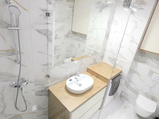 Łazienka: pralko-suszarka, lustro, prysznic, szafki, umywalka, sedes.