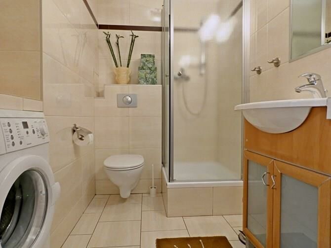 Łazienka: prysznic, pralka, WC, umywalka.