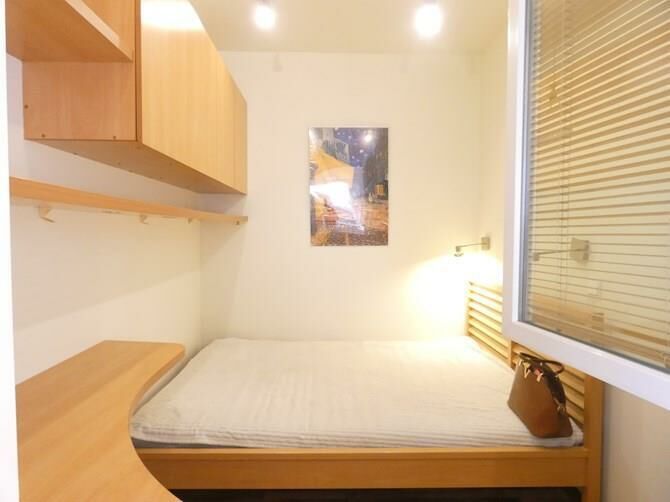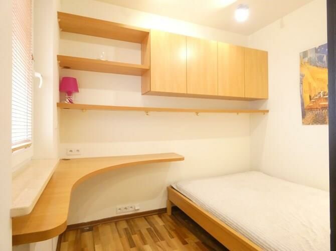 Sypialnia: łóżko (140x200), biurko, szafki.