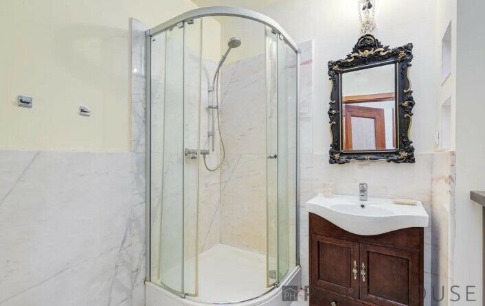 -Podłoga : marmur włoski , parkiet dębowy kl I-II. Ściany marmur