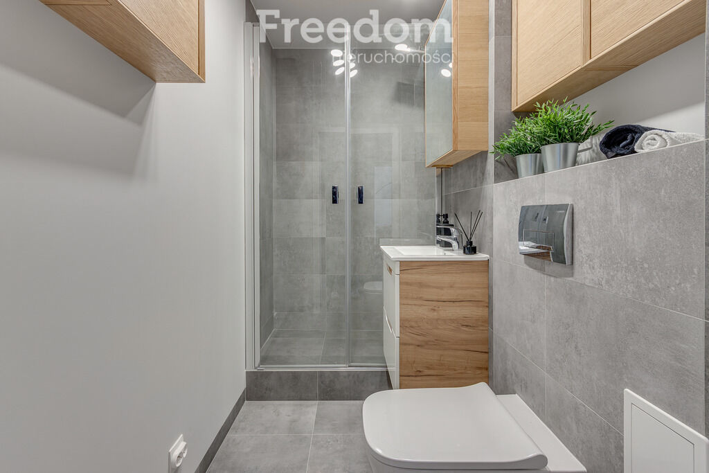 sprzęt AGD. Łazienka po remoncie, z kabiną prysznicową.