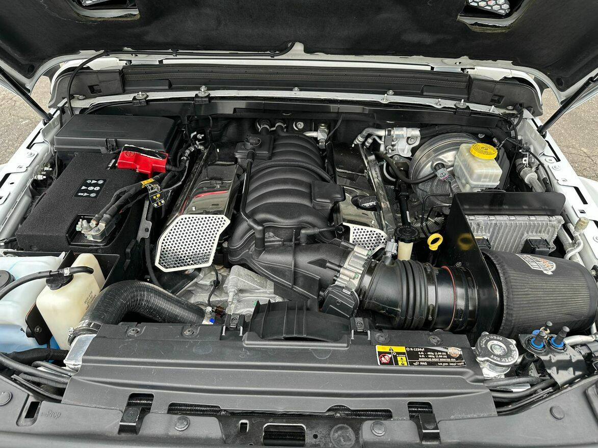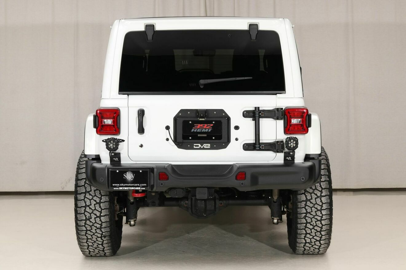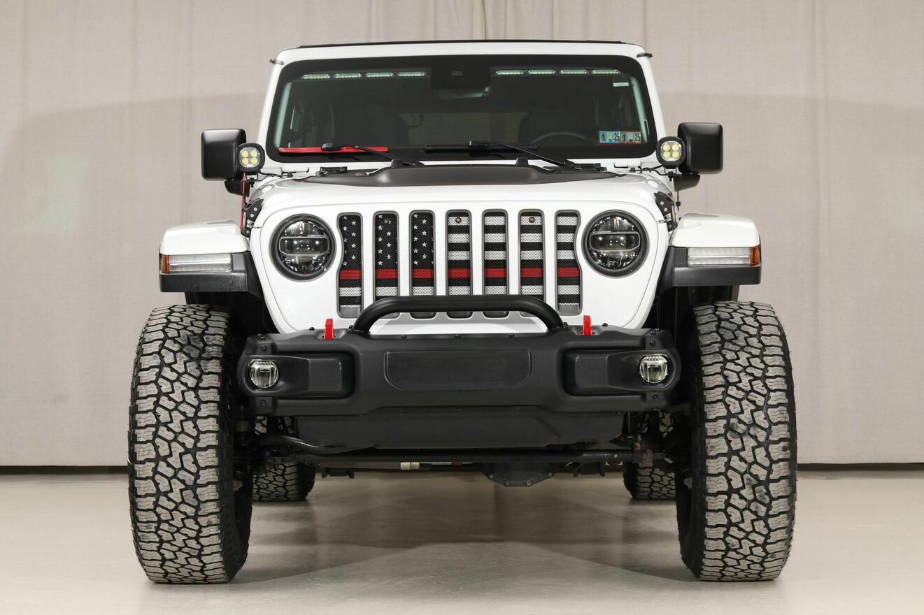 The selling dealer states that North Carolina-based RubiTrux replaced this Wrangler's factory-fitted 3.6-liter V6 with a 6.4-liter V8. The list of modifications reported by the seller also includes 20-inch XD wheels, a TeraFlex Suspensions lift kit, an American flag insert in the grille, tinted windows, a DV8 Offroad spare wheel delete kit, a Quadratec windshield light bar, and aftermarket interior lighting.