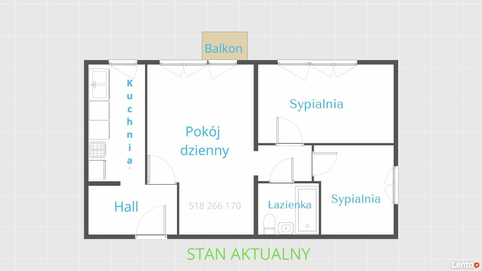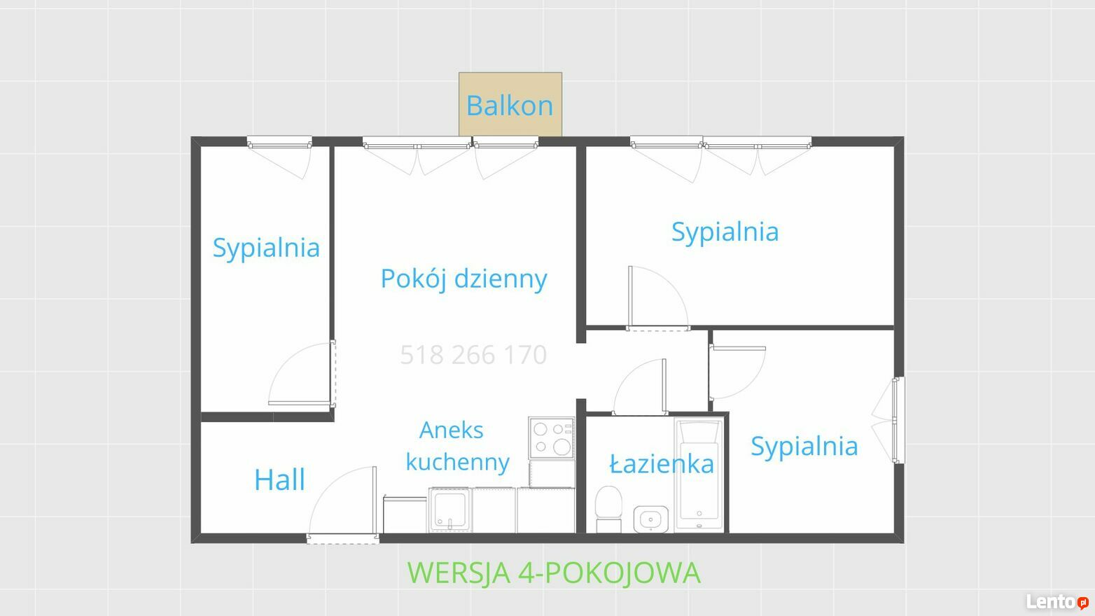 Lokal ma ogromny potencjał aranżacyjny. Bardzo łatwo można przerobić mieszkanie na 4-pokojowe (wariant zamieszczony na zdjęciu) lub uzyskać 3-pok. z otwartym lub półotwartym aneksem kuchennym.