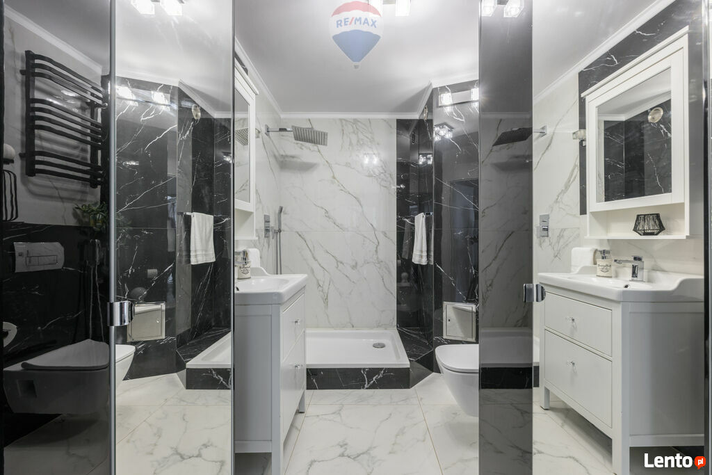 • Elegancka łazienka w bieli z czarnymi akcentami – idealne
