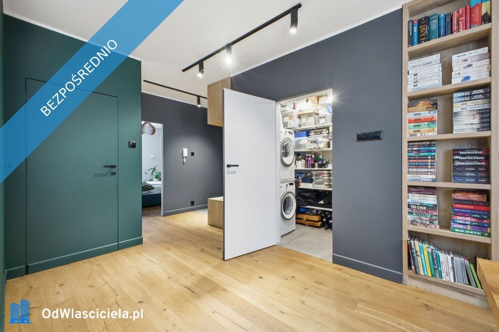 Solidny standard wykończenia – zabudowa stolarska w kuchni, łazience i przedpokoju, drewniane deski na podłodze, wszystkie drzwi ukryte. Efekt: spójne i dające poczucie przestrzeni wnętrze przy jednoczesnym efektywnym jej wykorzystaniu