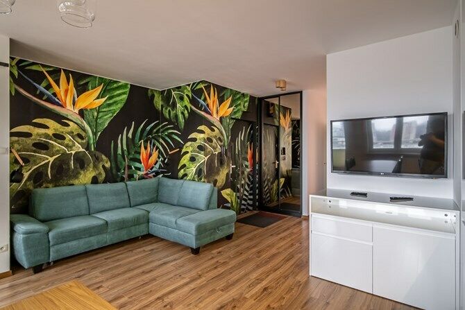 W skład wchodzi sypialnia z dużą garderobą, salon z aneksem