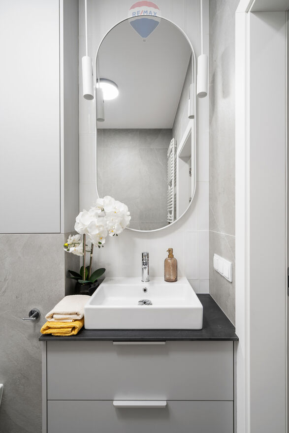 pralko‑suszarką w zabudowie, lustra podświetlane, wykończenie