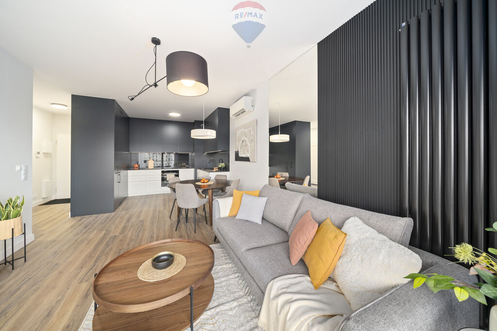 Salon z otwartą kuchnią i jadalnią umeblowany, główna sypialnia