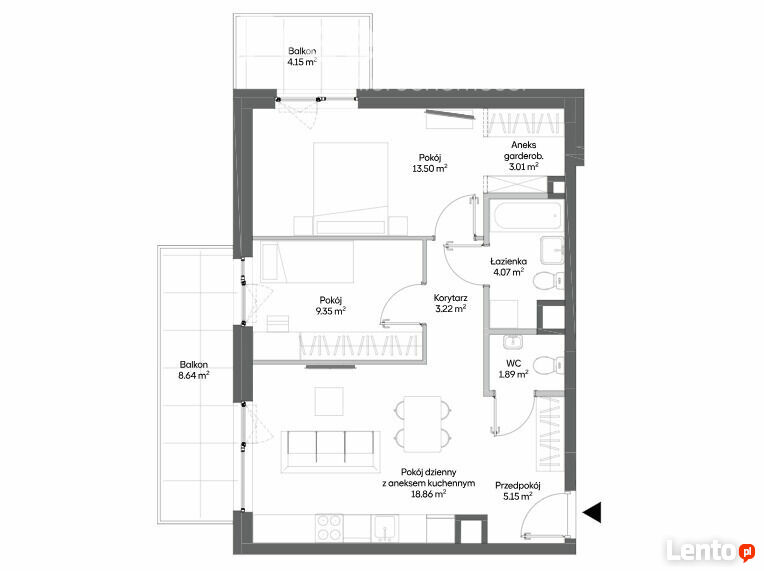 Na powierzchnie (59,05 m2) mieszkania wchodzi:
