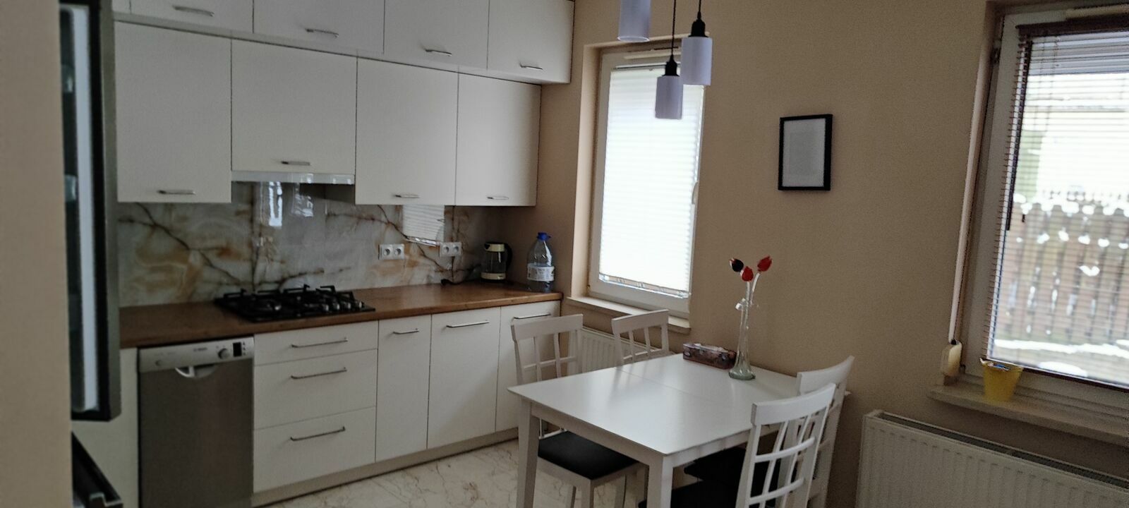 - salonu z aneksem kuchennym (25 m2). W salonie znajdziemy narożnik, stolik kawowy, witryny oraz niedużą komodę. W kuchni znajdziemy stół z krzesłami, dużo szafek do przechowywania, dużą lodówkę , piekarnik, zmywarkę, mikrofalówkę.