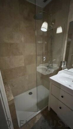 drewniane wykonane na zamówienie. W łazienne kamień trawertyn.