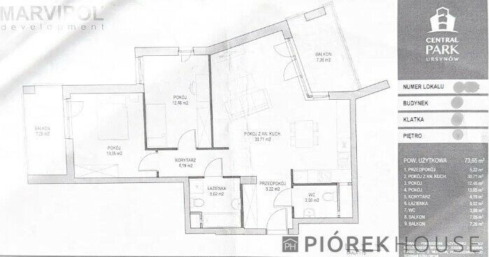 Mieszkanie o powierzchni 73,6 m2 składa się z: