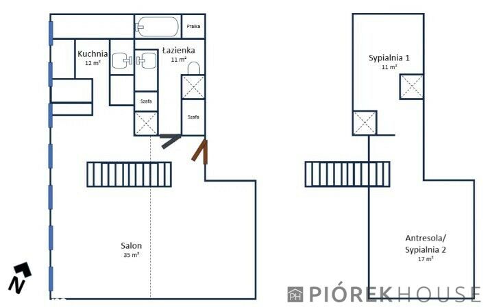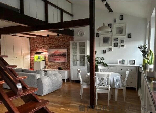 - Na dole: jasny salon, nowoczesna kuchnia oraz łazienka