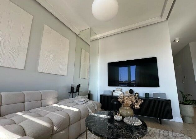 -Salon – jasny, elegancki, z designerską szafką RTV, marmurowym