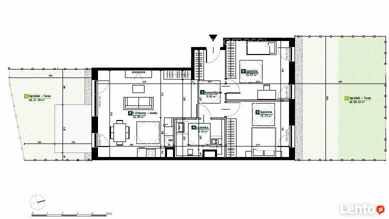 dwóch ogródków z tarasami – ok. 31,10 m2 i ok. 50,33 m2.