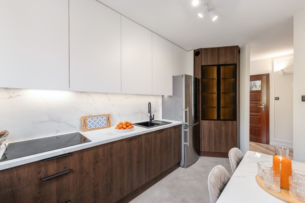 - duża kuchnia z zabudową na wymiar, pełne AGD oraz pojemna, przeszklona witryna z oświetleniem LED
