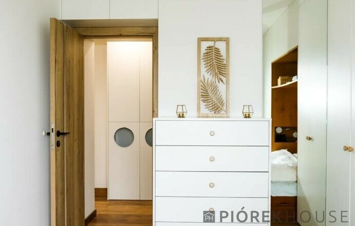 -przedpokój z zabudowanymi szafami oraz schowkiem gospodarczym, o