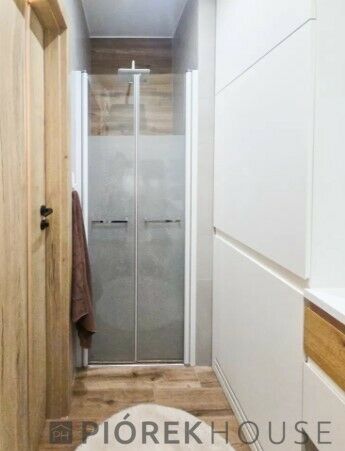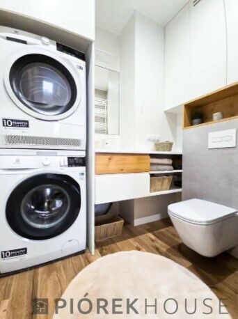 -ustawna łazienka z prysznicem oraz pralnia z licznymi szafkami, o