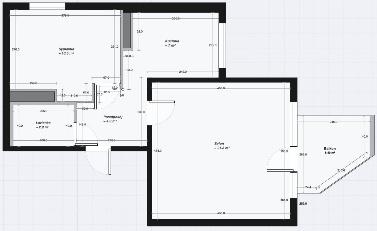 • 47 m² – dwa niezależne pokoje + osobna kuchnia + balkon