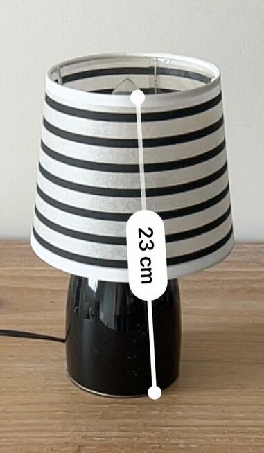 Mała lampka nocna o wysokości 23 cm. Ceramiczna podstawa w kolorze czarnym, abażur materiałowy w biało-czarne paski. ...