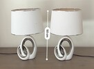 Dwie lampki stołowe z ceramicznymi podstawami w kolorze biało-srebrnym. Podstawy mają dekoracyjny kształt dwóch ...