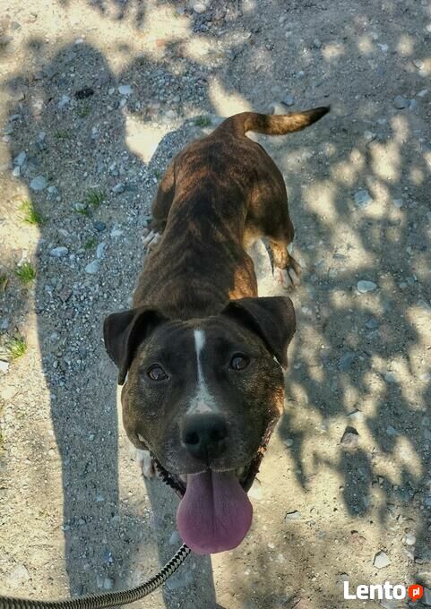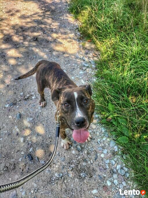 Aksa to młoda suczka w typie amstaffa.
