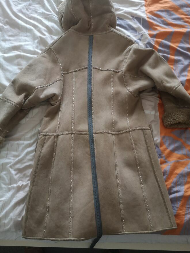 Wymiary kożucha od pachy do pachy 55x2 = ok. 110 cm dookoła, mierzyłem zewnętrznie miarką krawiecką przy zapiętych klipsach oraz guzikach. Pozostałe wymiary pokazuje wizualnie na zdjęciu. Długość całkowita bez kaptura 97 cm mierzyłem miarką krawiecką, ostatnie zdjęcie.