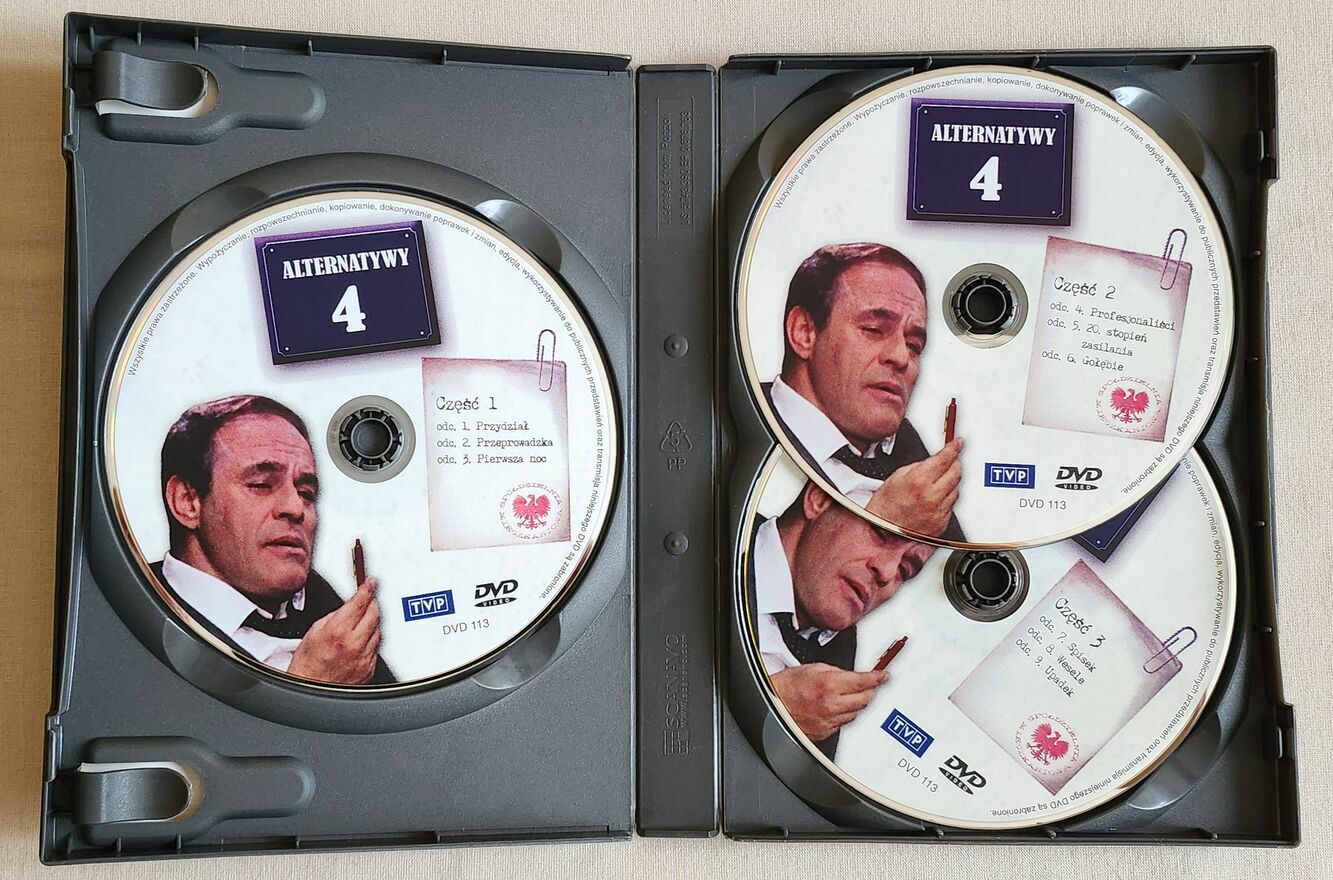 "ogłoszenie widoczne == AKTUALNE"Serial Alternatywy 4 na trzech płytach dvd, zestaw z kompletem odcinków. Płyty bez uszkodzeń w bardzo dobrym stanie.