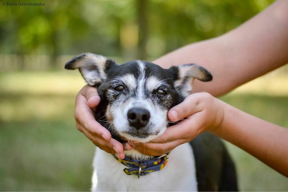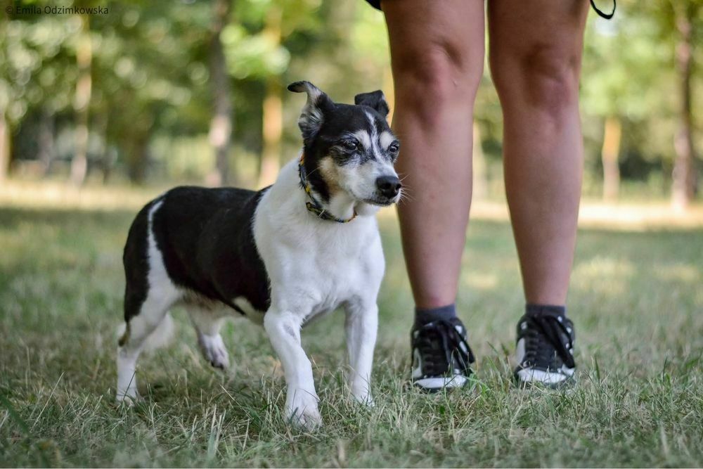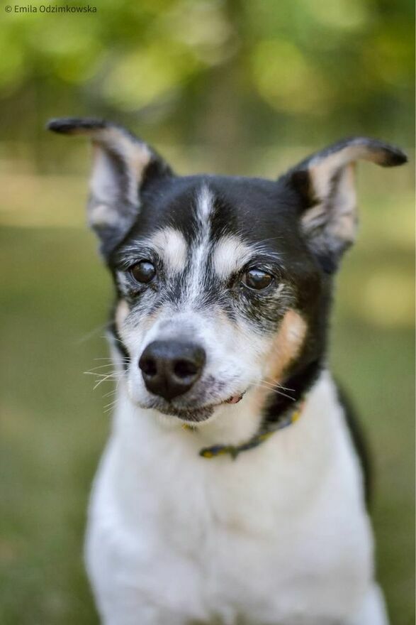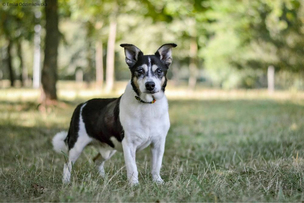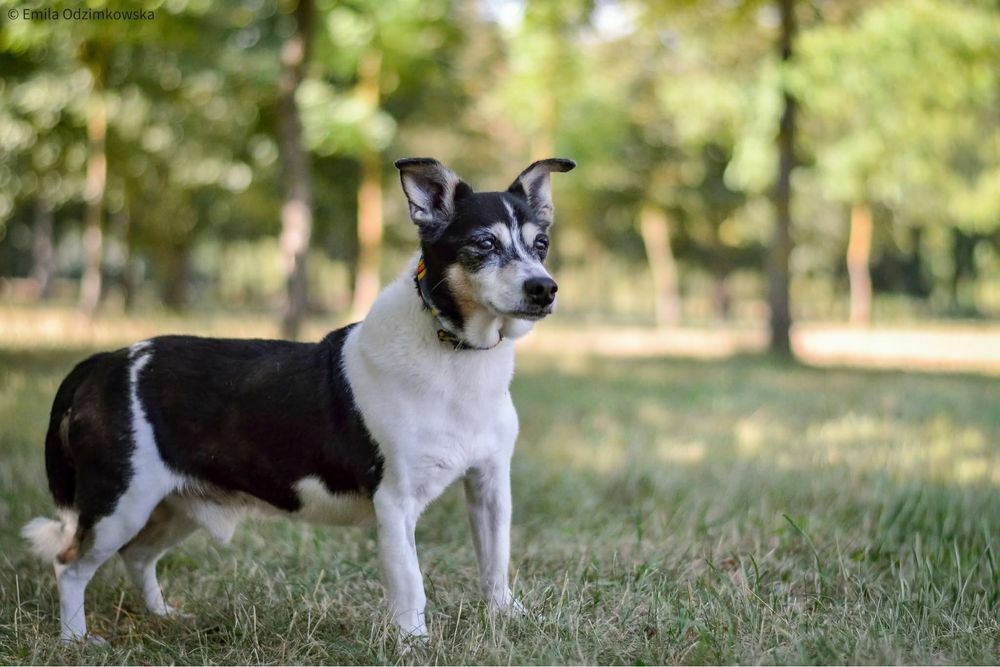 Amik-starszy czarno biały pies czeka na wymarziny dom-adopcja