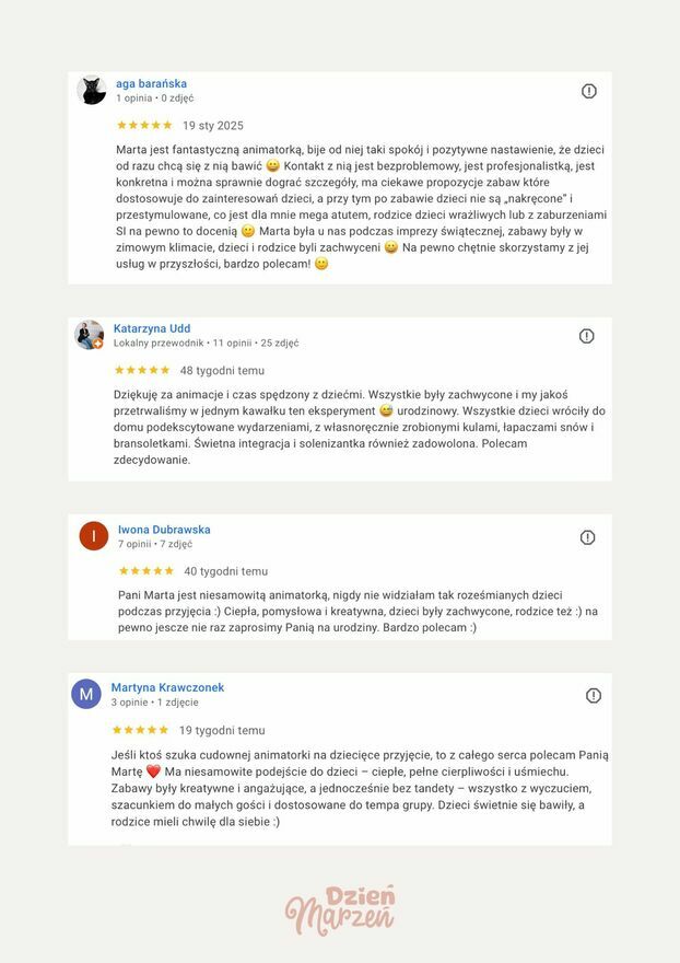 Organizujesz przyjęcie z udziałem dzieci?Jako psycholog z wieloletnim doświadczeniem prowadzę Dzień Marzeń, czyli spersonalizowane animacje w estetycznej formie. Moją pasją jest inspirowanie dzieci do twórczego rozwoju, stworzyłam setki programów animacyjnych, warsztatów i zabaw, które wspierają ich rozwój.