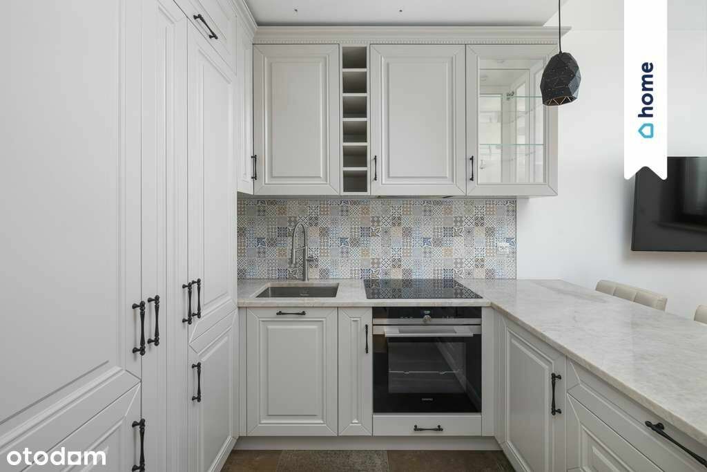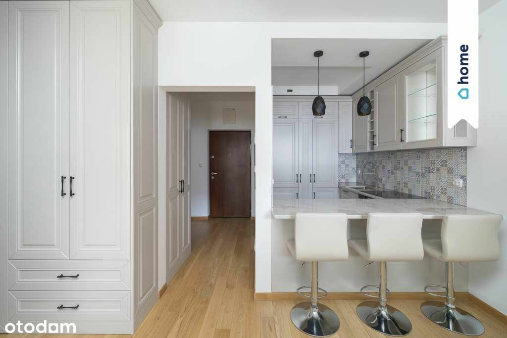 Apartament wykończony z dbałością o detale – dębowy parkiet, elegancka zabudowa kuchni i salonu, wydzielona garderoba.