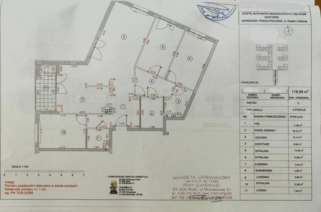 Czteropokojowe, słoneczne i ustawne mieszkanie o pow. 118,99 m2 w ogrodzonym i chronionym 24h osiedlu "Santorini" na Warszawskim Grochowie. Mieszkanie usytuowane na trzecim piętrze czteropiętrowego budynku z cegły z 2010 r. (z windą). Mieszkanie składa się z salonu o pow. 34,2 m2 z wyjściem na loggię o pow. 7,05 m2, częściowo połączonego z w pełni umeblowaną i wyposażoną w agd widna kuchnią o pow. 12,4 m2, trzech sypialni o pow. 13,68 m2, o pow. 13,59 m2 i o pow. 12,86 m2, dwóch łazienek o pow. 5,66 m2 i o pow. 3,44 m2, przedpokoju o pow. 18,91 m2.Mieszkanie wykończone, gotowe do wprowadzenia po ewentualnym odświeżeniu.