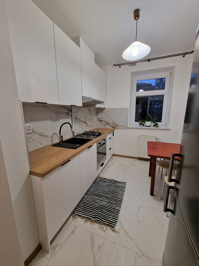 Mieszkanie po kompleksowym remoncie, umeblowane i wyposażone w niezbędny sprzęt AGD. W łazience i WC ogrzewanie podłogowe.