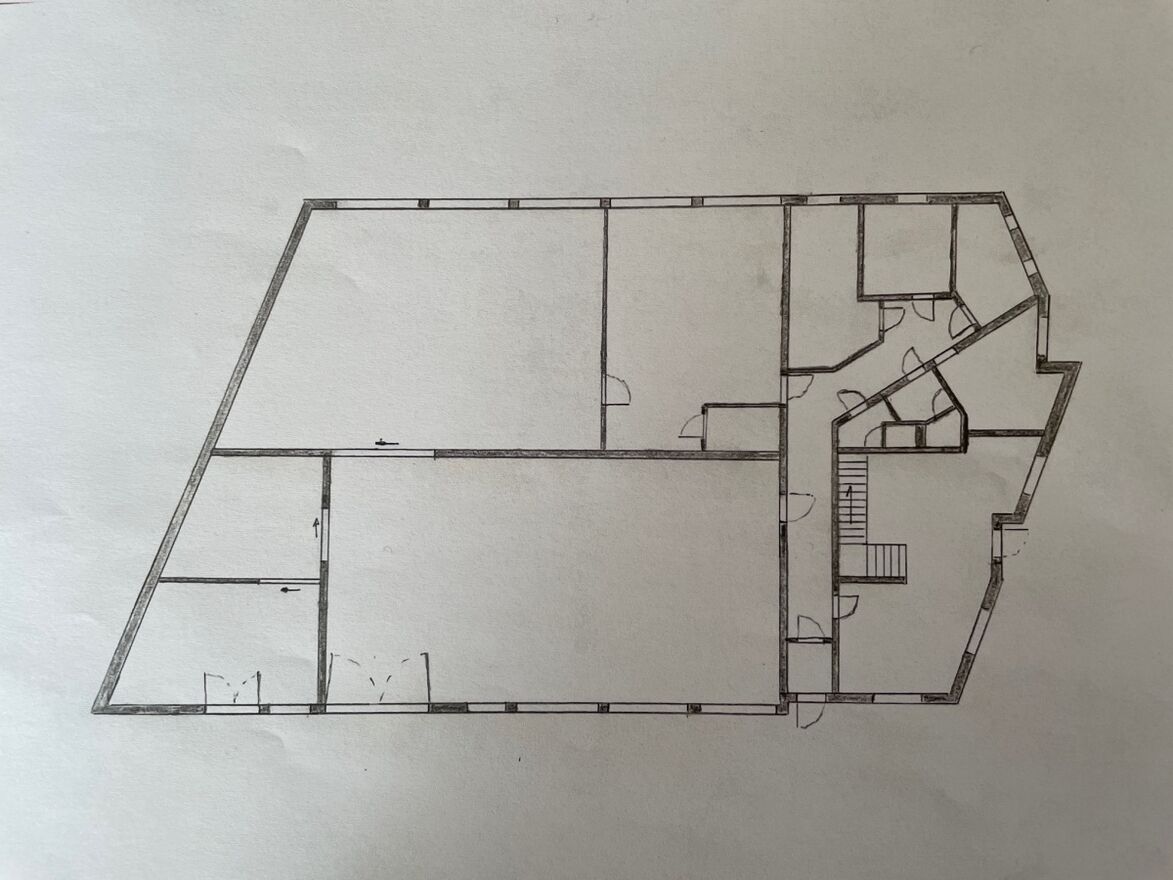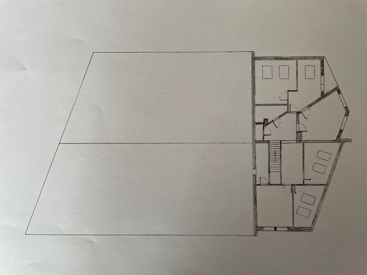 Tył (parter) - ciąg dwóch hal o wysokościach 4 m (środek) i 3 m (ściany), z oknami i skośnym sufitem – idealne na produkcję.