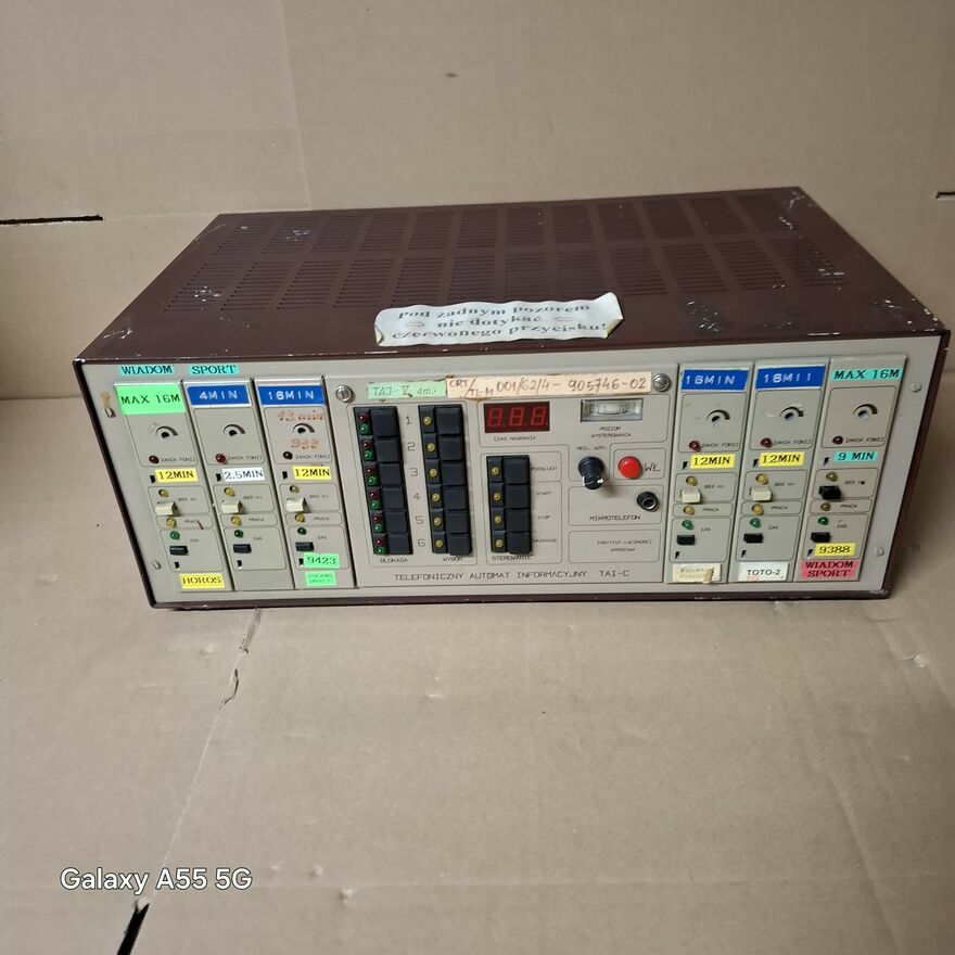 Jest to telefoniczny automat informacyjny TAI-C, urządzenie z czasów PRL-u, które służyło do odtwarzania nagranych wiadomości po wybraniu odpowiedniego numeru.Urządzenie na panelu posiada przyciski z opisami takimi jak „WIADOM”, „SPORT” czy „HOROS”, co sugeruje, że można było odsłuchać wiadomości, prognozy sportowe i horoskopy.