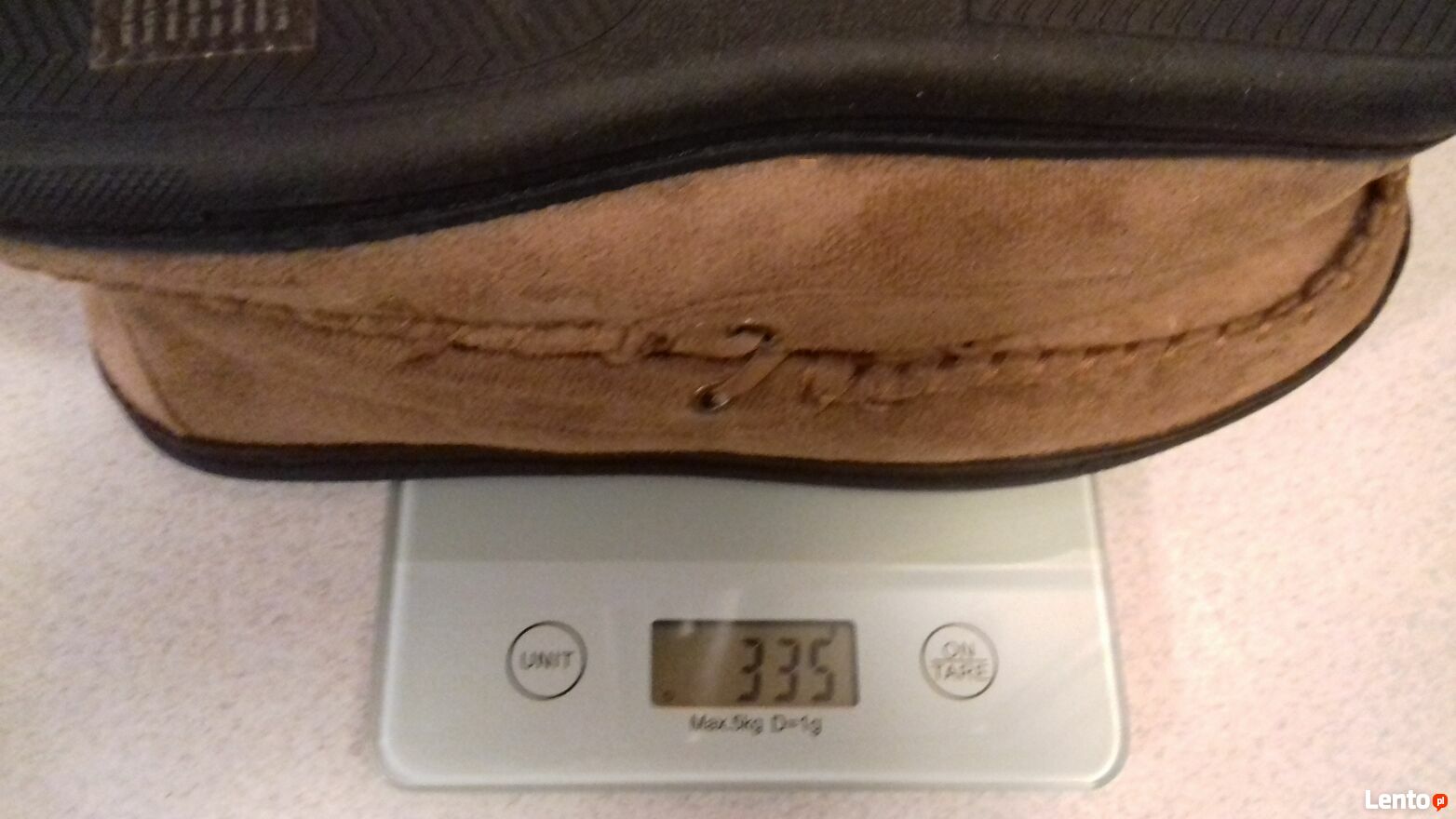 Zamszowe, w naturalnym ciemno-beżowym kolorze.Wewnątrz wyściełane delikatnym, miękkim futerkiem.