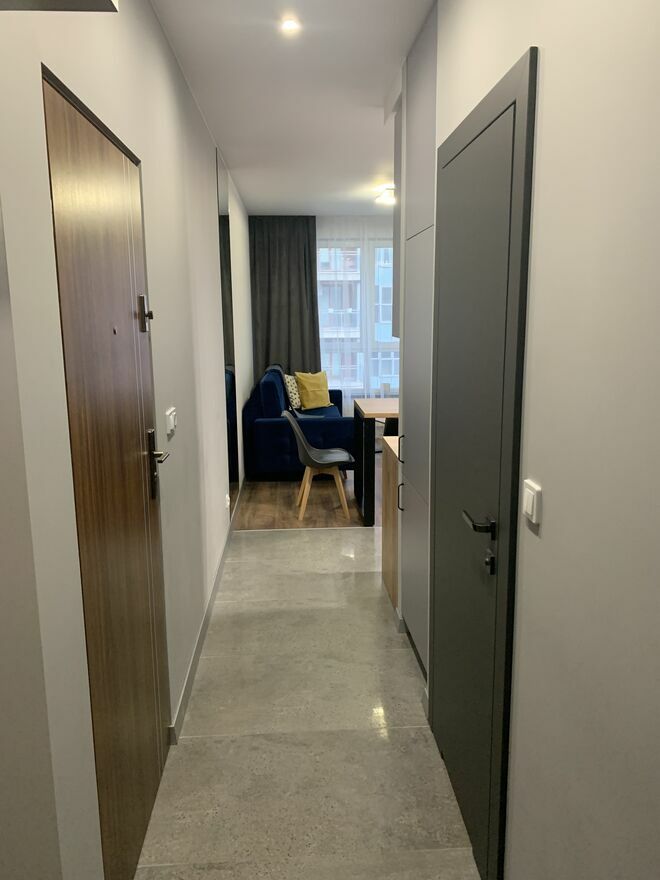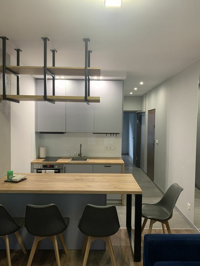 Powierzchnia mieszkania wynosi 33 m². Jest ono kompletnie umeblowane, wyposażone w sprzęt AGD, w tym pralko-suszarkę, lodówko-zamrażarkę, zmywarkę oraz piekarnik z płytą indukcyjną, okap. Ponadto, dostępny jest telewizor oraz WI-FI . Dodatkowo, w mieszkaniu znajduje się drobne wyposażenie w zakresie gospodarstwa domowego: talerze, sztućce.