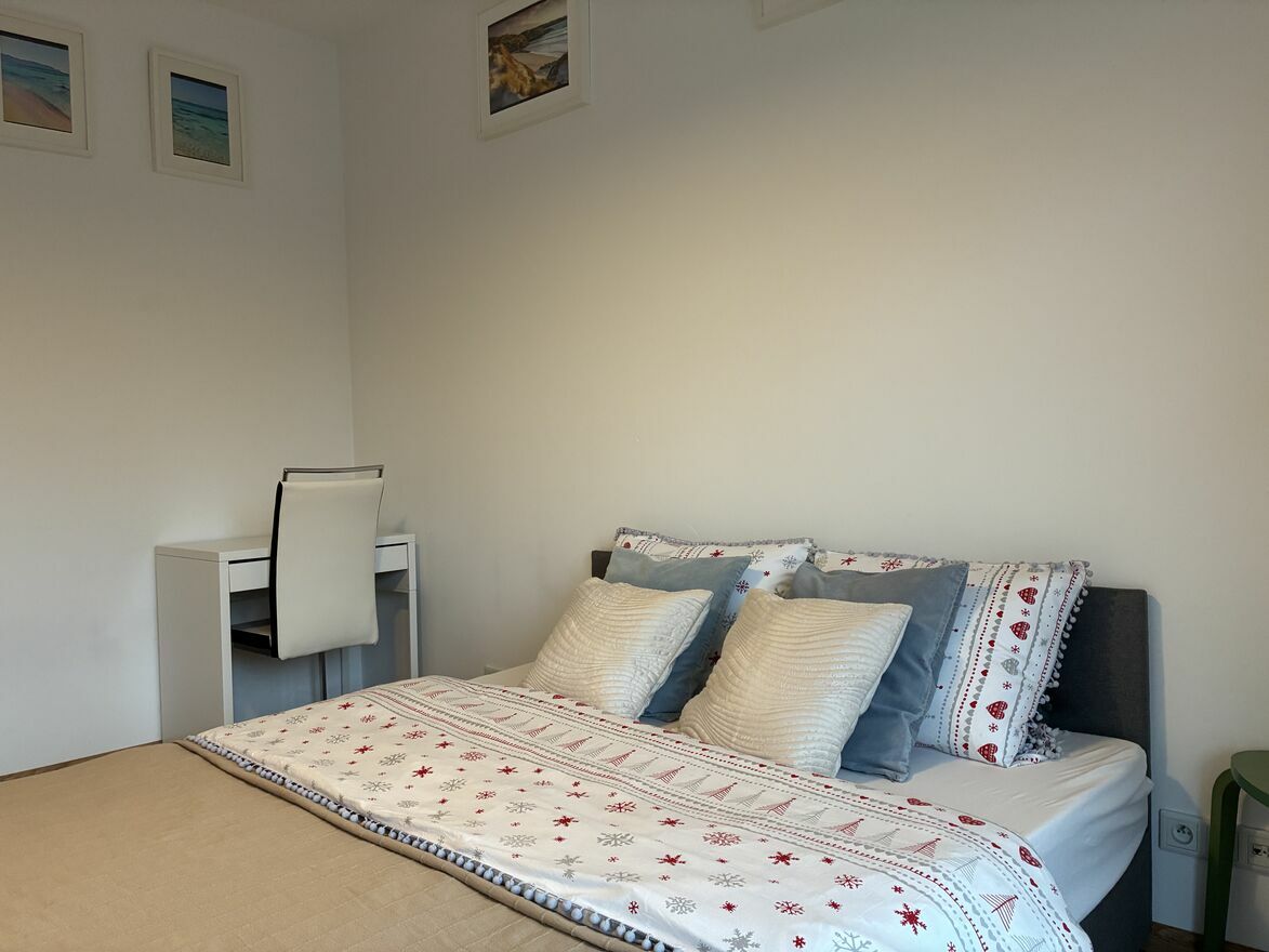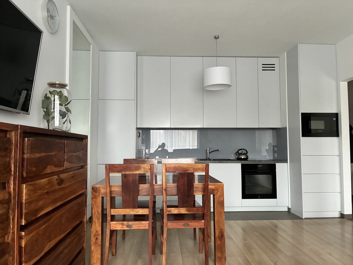 • Standard wykończenia: Mieszkanie w pełni urządzone na własne potrzeby właściciela z dbałością o jakość materiałów i funkcjonalność przestrzeni. Mieszkanie umeblowane meblami wykonanymi na wymiar, wykorzystujące maksymalnie powierzchnię. Nowe meble kuchenne, AGD wysokiej klasy, meble drewniane. Ponadto łazienka z nowym prysznicem, pralką oraz automatyczną suszarką. Sypialna z szafa wykonaną na wymiar oraz podwójne łóżko. Mieszkanie zostało wyposażone w wysokiej jakości klimatyzację, zarówno w salonie i sypialni. Ogromny taras dostępny zarówno z salonu, jak i sypialni.