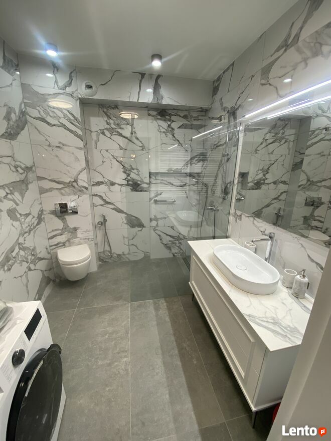 W łazience przeszklony prysznic z deszczownicą, toaleta,, duża szafka z umywalką nablatową, pralka, dodatkowe grzanie podłogowe z termostatem.