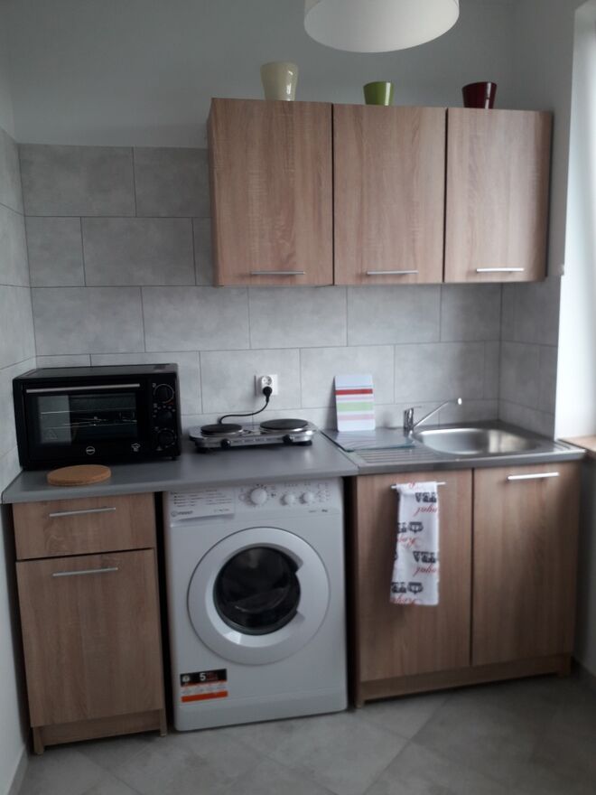 Salon z aneksem kuchennym i urządzona łazienka. Mieszkanie całkowicie wyposażone, do zamieszkania.