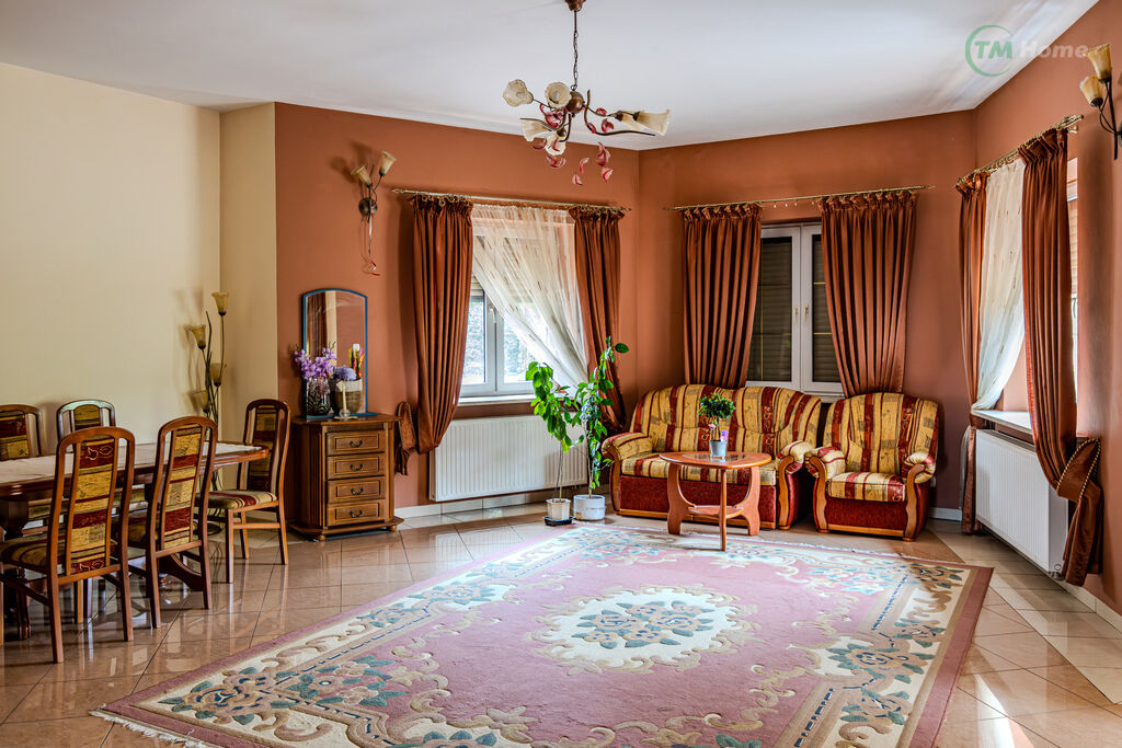 - Jasny salon z dużymi oknami, wydzieloną częścią wypoczynkową z